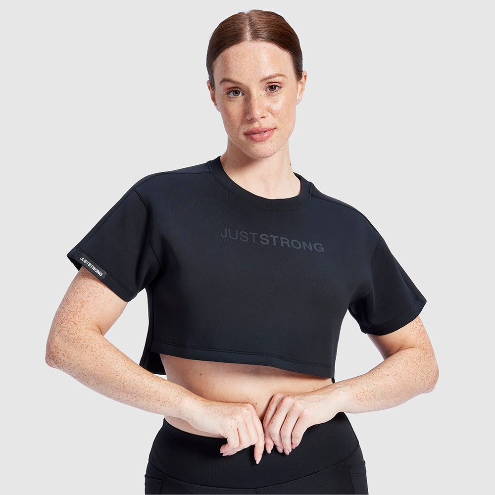 This JustStrong Black Oversized Athletic Cropped Tonal T-Shirt is made with a super breathable fabric that feels luxurious to the skin. It features a JustStrong detail badge on the arm and a tonal print to the center chest for a minimalistic, quality design. Perfect for any sort of workout, this T-shirt is sure to keep you comfortable and stylish.