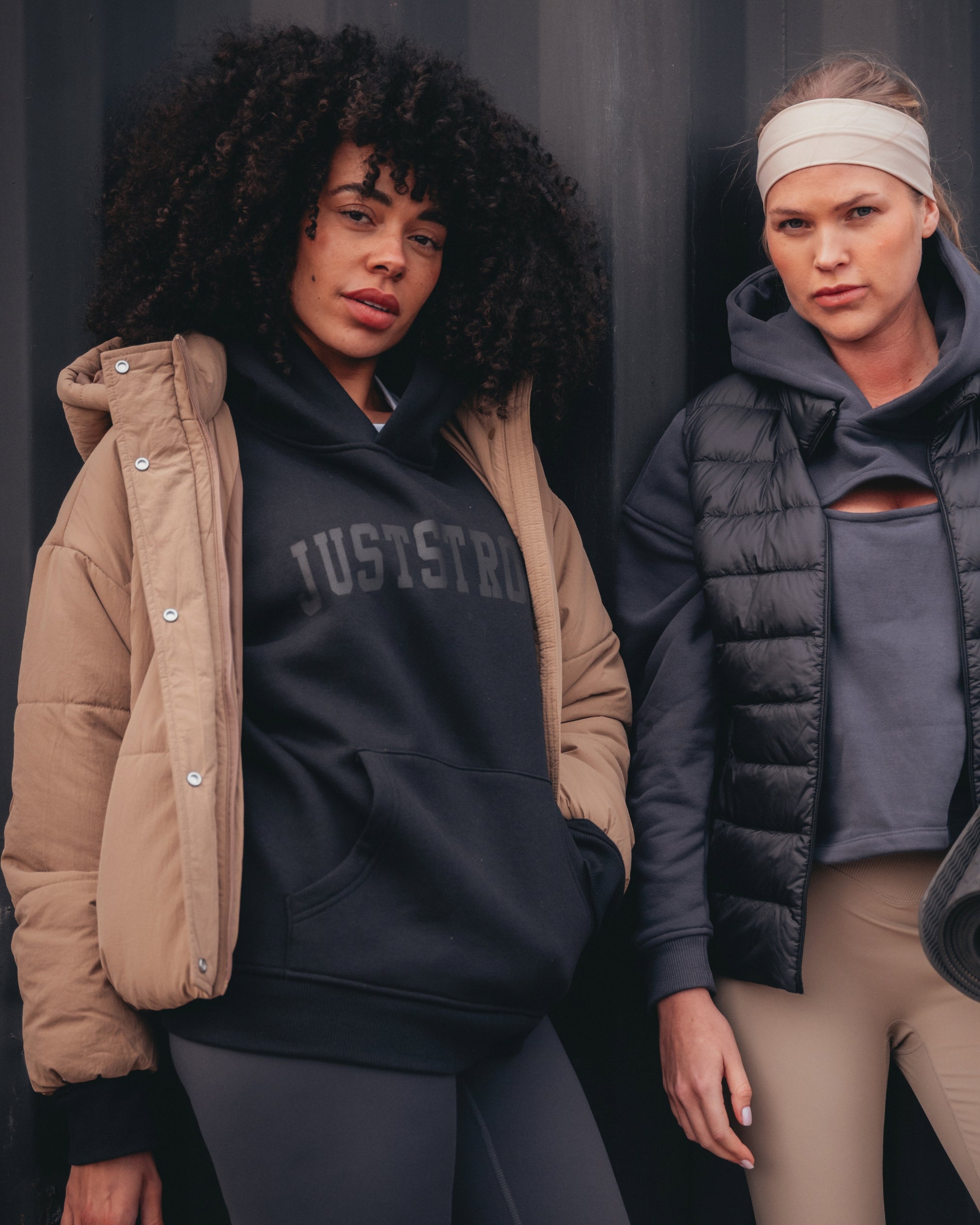 Features: Dropped Shoulders, Cuffs & Hem, Subtle "JUSTSTRONG" Printed Logo, Kangaroo pocket.